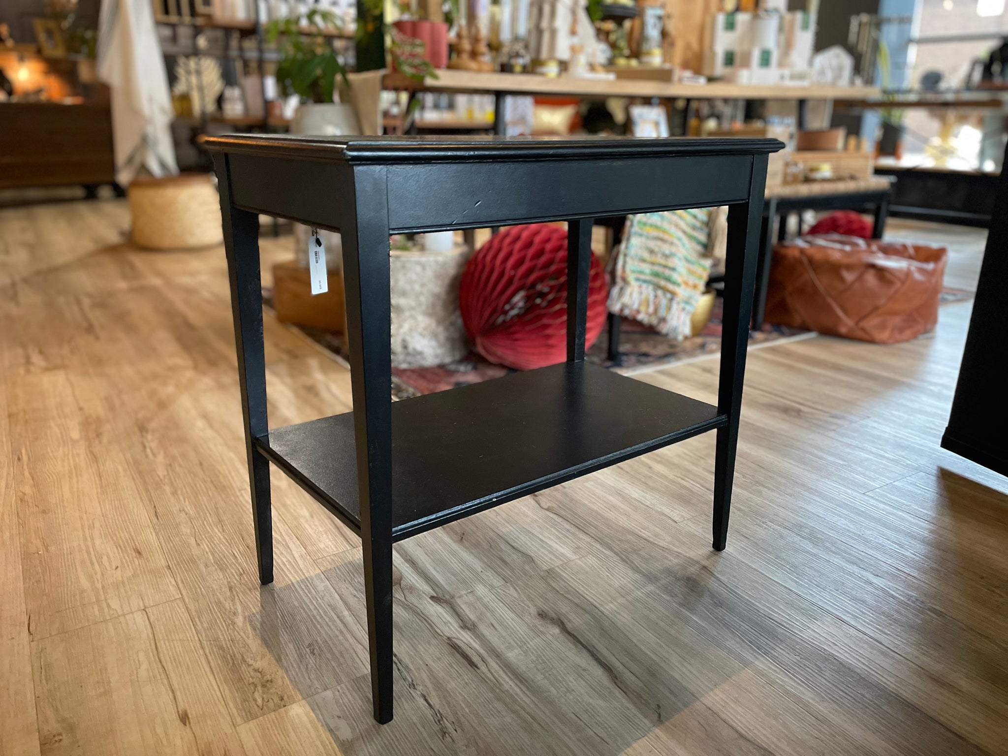 Discover the understated elegance of this meticulously restored two-tier side table, a versatile accent piece that seamlessly complements both contemporary and traditional interiors. Hand-refinished in Wise Owl enamel's signature Jet Black, this table showcases a rich, durable finish that resists everyday wear while maintaining its sophisticated sheen. The dual-tier design provides practical storage and display opportunities—perfect for styling with books, plants, or decorative objects. Each tier offers distinct visual interest and functional space, making this piece an ideal solution for living rooms, bedrooms, or entryways where style and utility converge. A thoughtfully curated addition for those who appreciate timeless design.