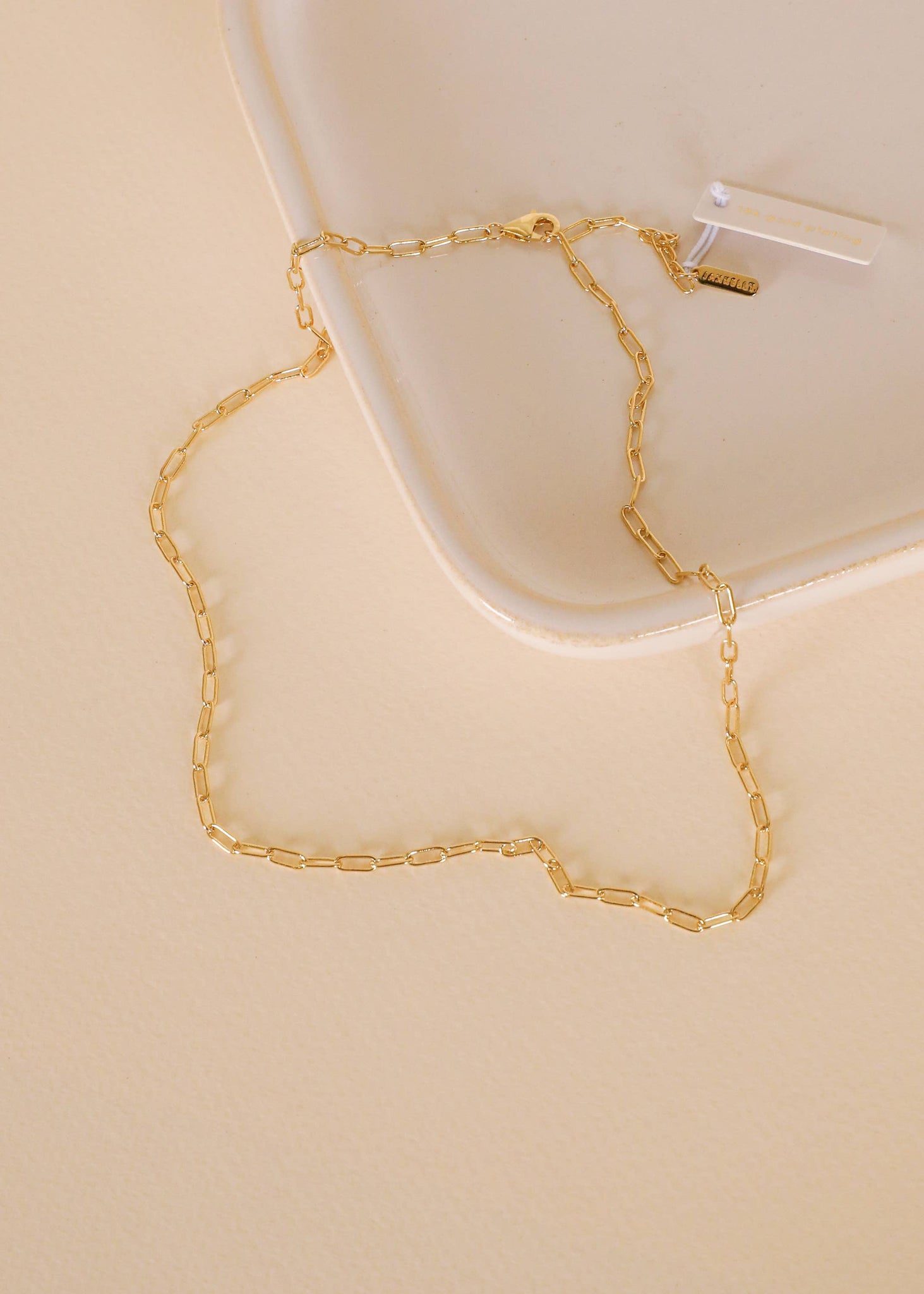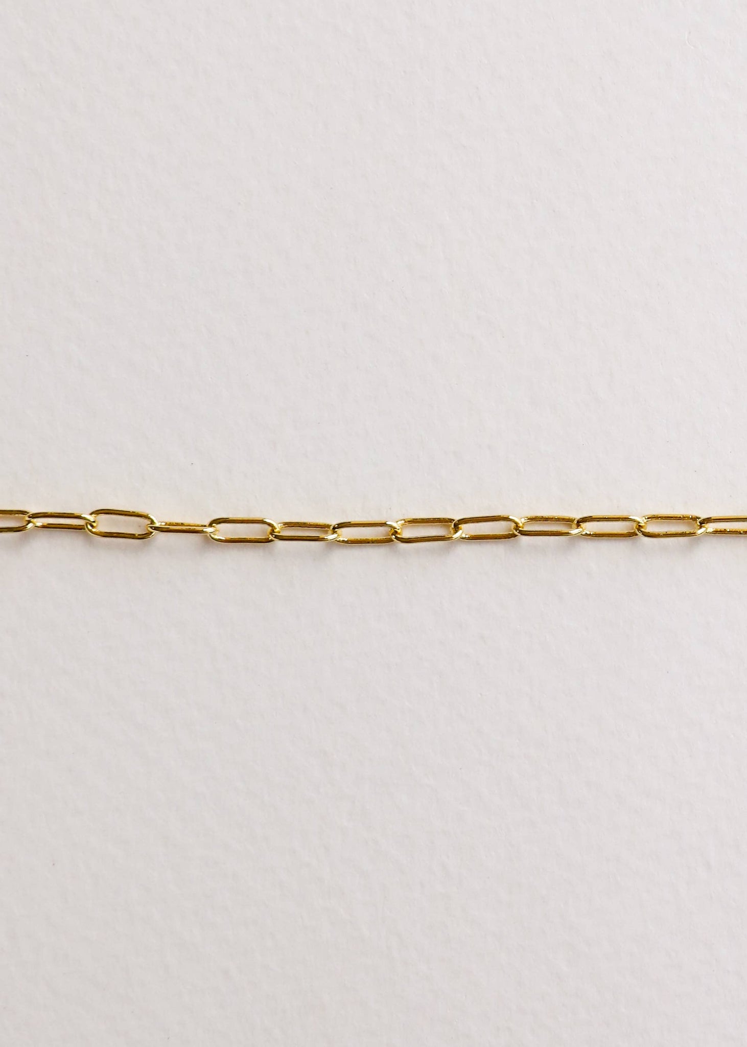 The smallest of our paper clip chains. A simple and sophisticated chain to elevate your look. Looks great layered or worn on its own.