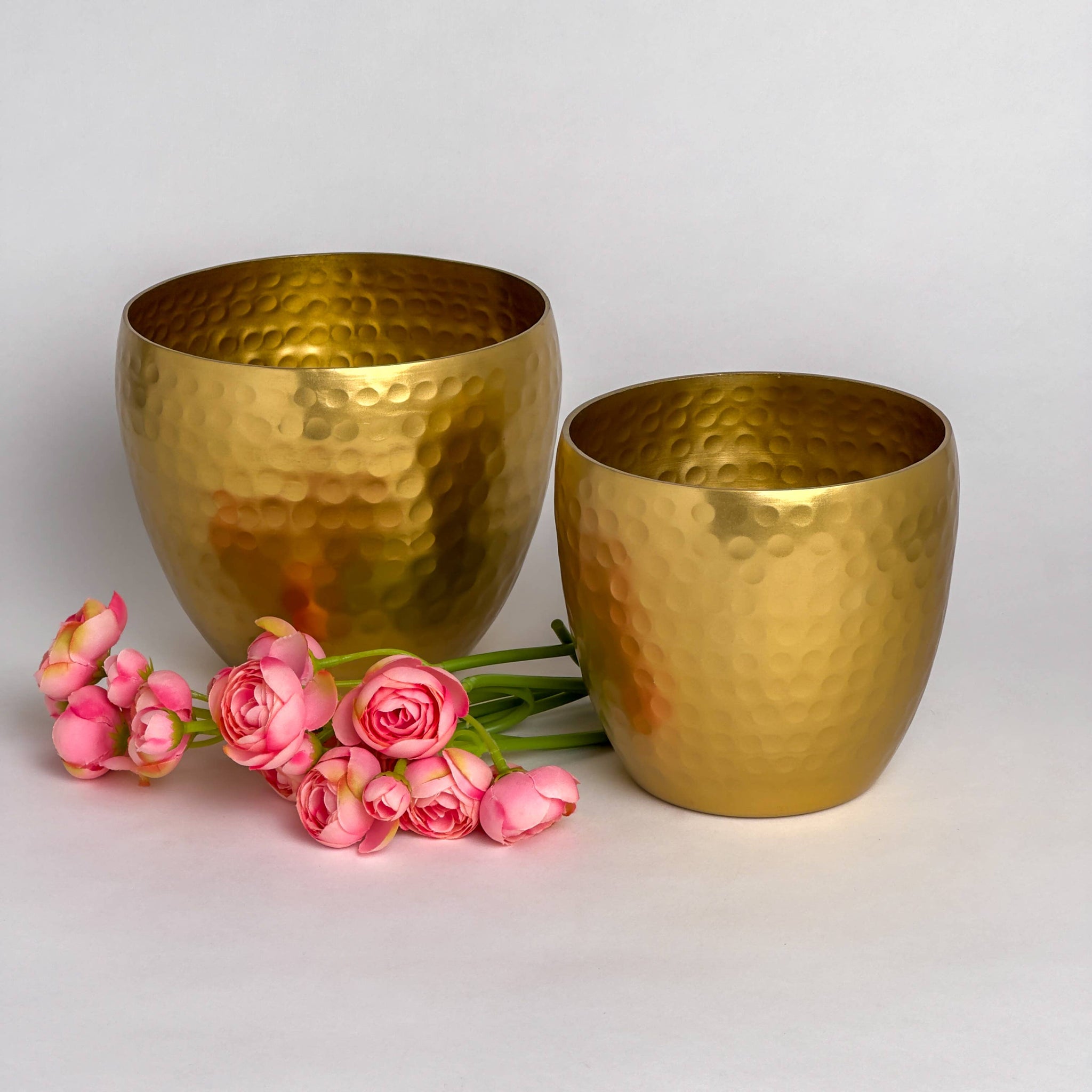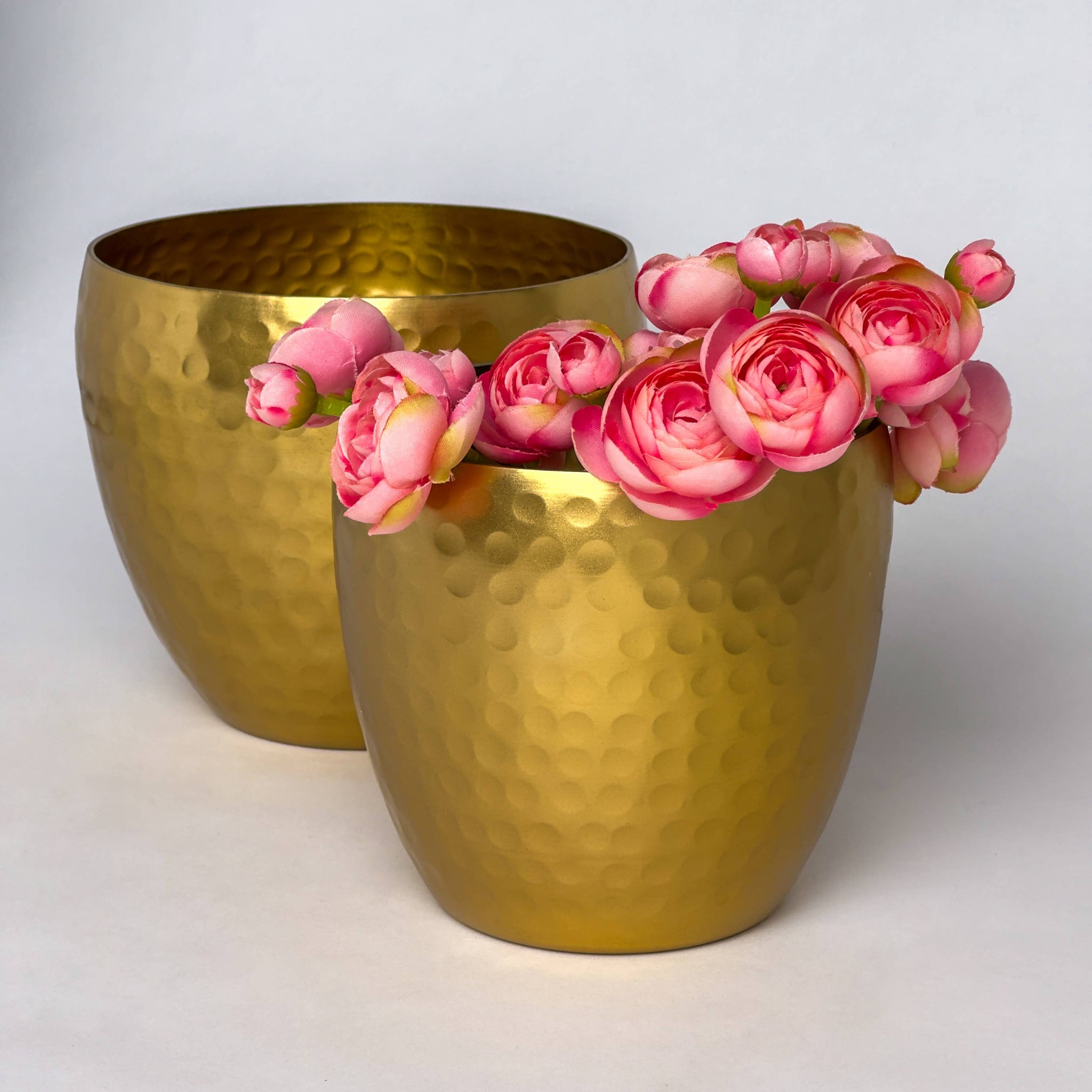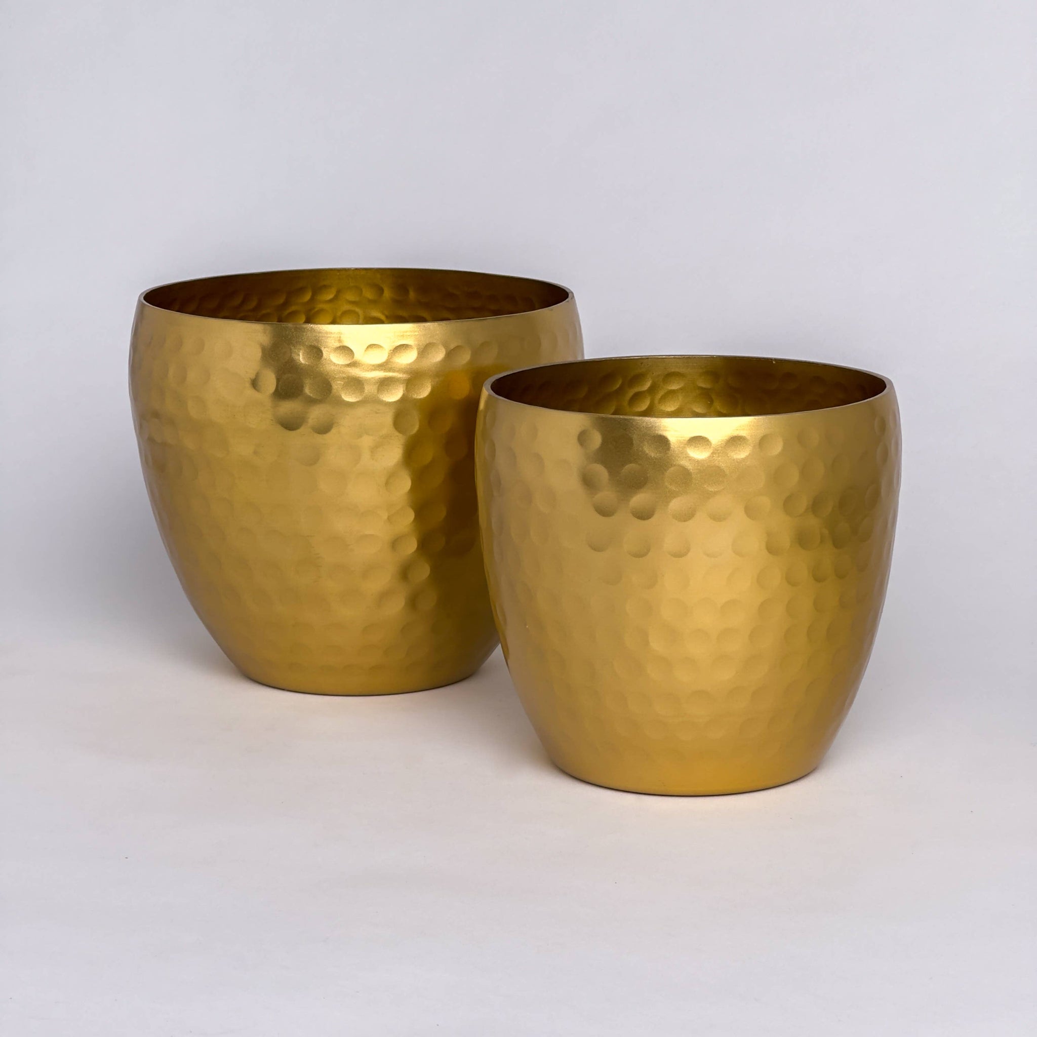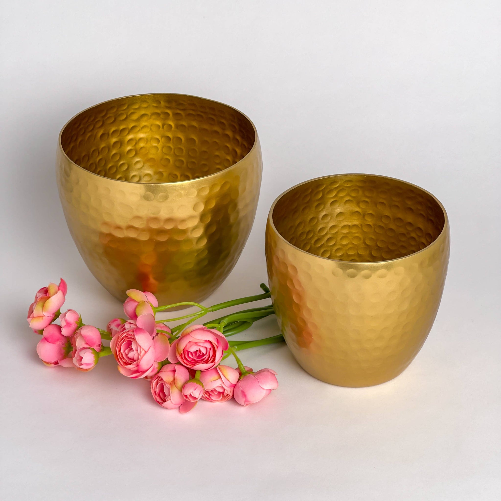 Enhance the beauty of your indoor or outdoor space with our exquisite Gold Hammered Planters. This set of two planters is designed to add a touch of elegance and sophistication to any environment.