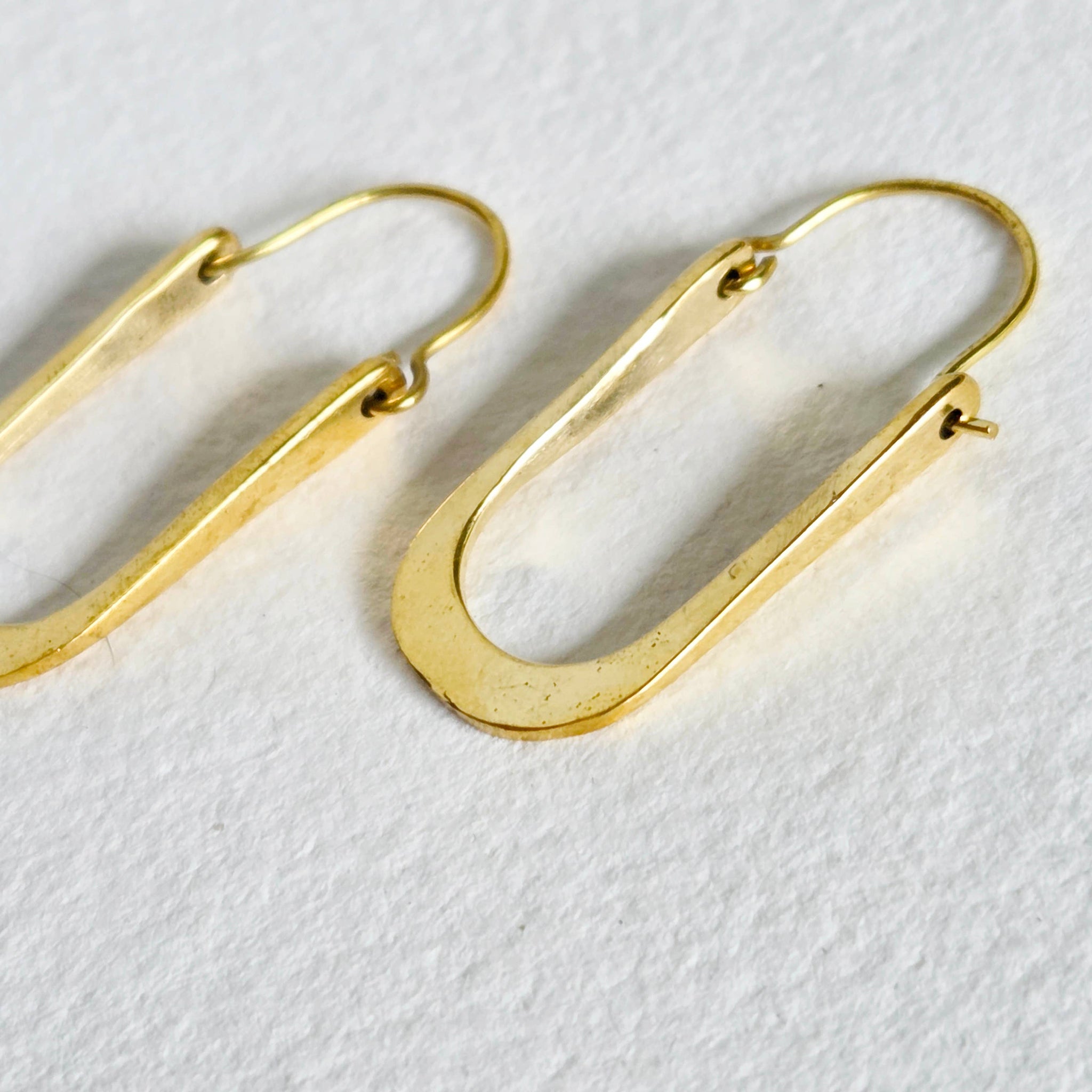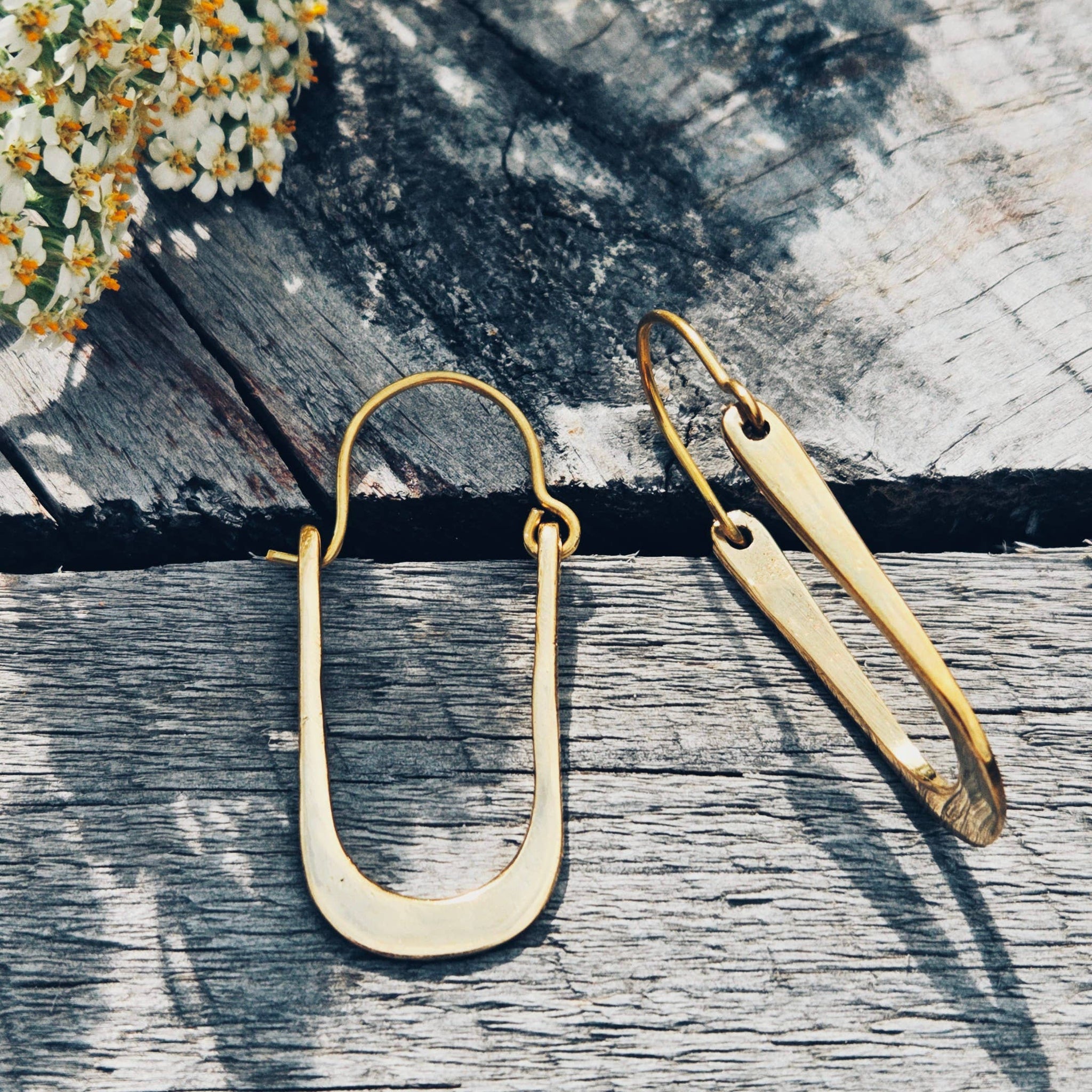 Brass unique oval hoop earrings. Part of the lost art molten wax collection. Pieces are handmade and show natural handcrafting imperfections. Solid brass. 1 3/4" long